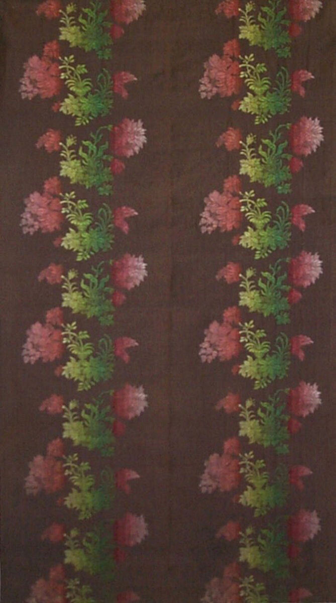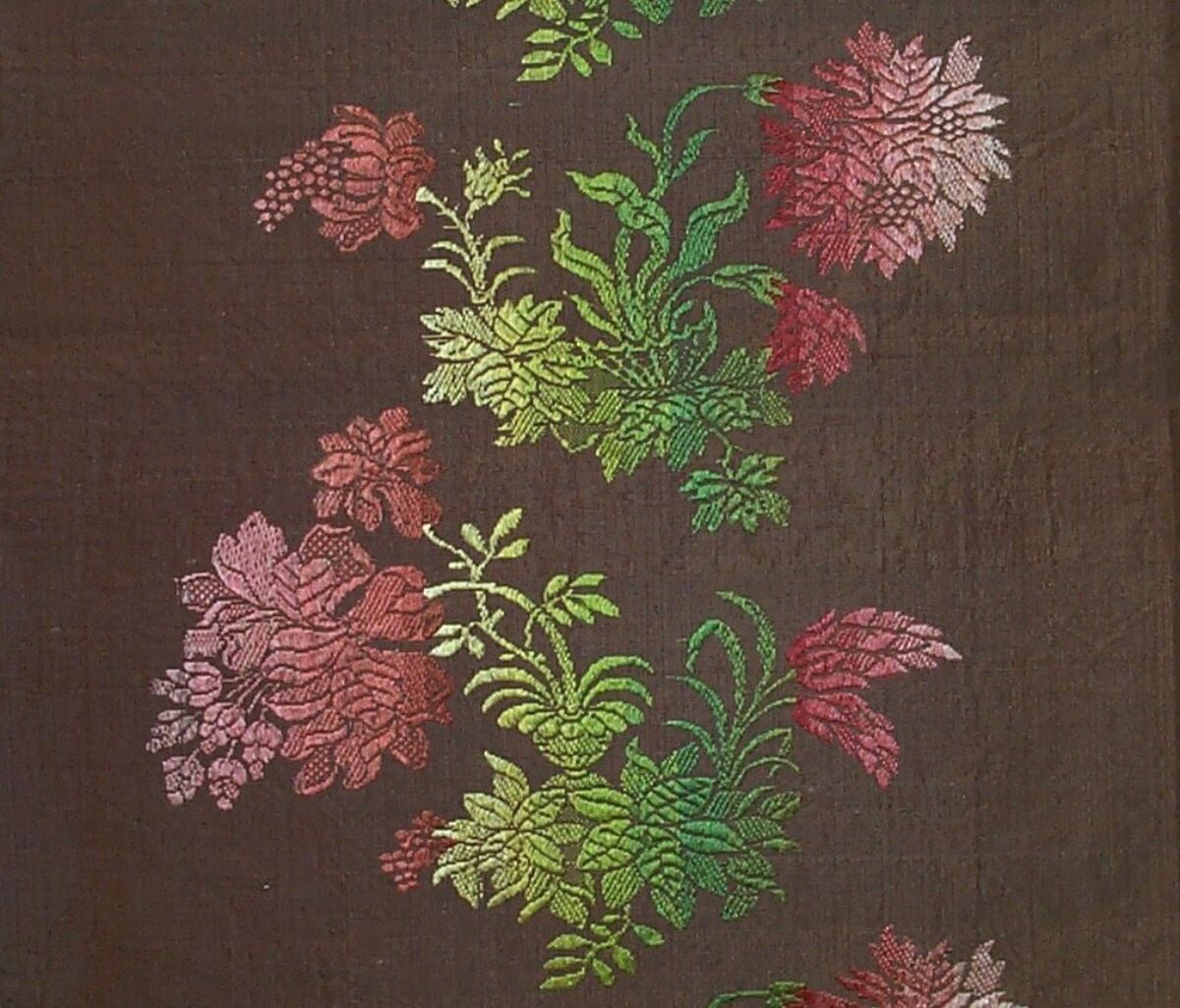 18th century English or Dutch silk warp brocade with brown ground and pink and green floral pattern in two vertical bands. (two lengths available)