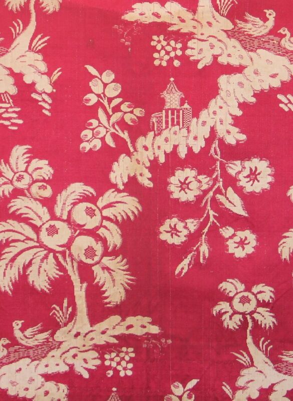 c.1740 – 50 French raspberry colored silk patterned with a white damask “Chinoiserie” design of repeated palms, pagoda, and birds.