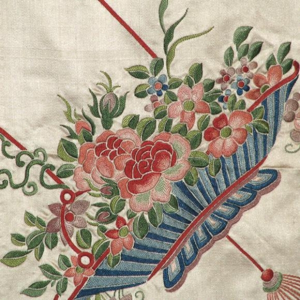 19th century Chinese export (Macao) champagne colored silk bed cover embroidered in polychrome silk threads in designs of floral sprays, floral baskets, and a central floral motif. The colors are soft salmon, coral, blue, and green.