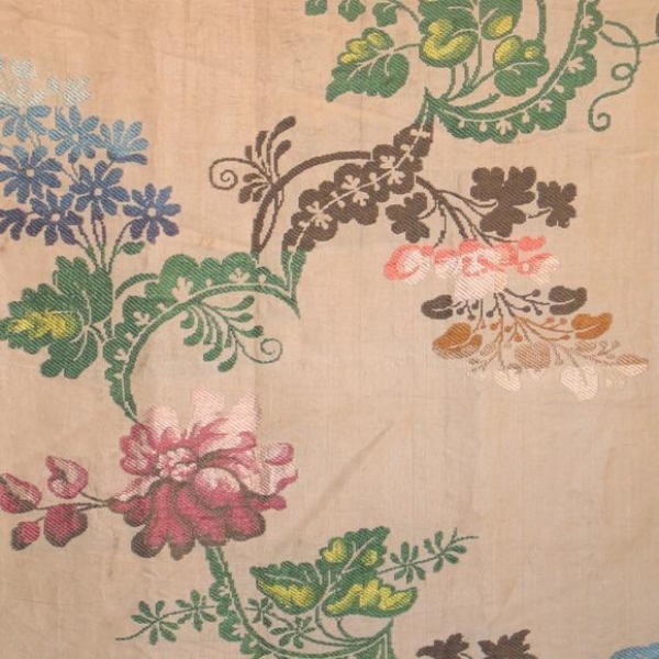 One of 2 pieces of c.1750 Dutch cream colored silk brocade, brocaded in floral meanders of violet, blue, peach, green, and brown.