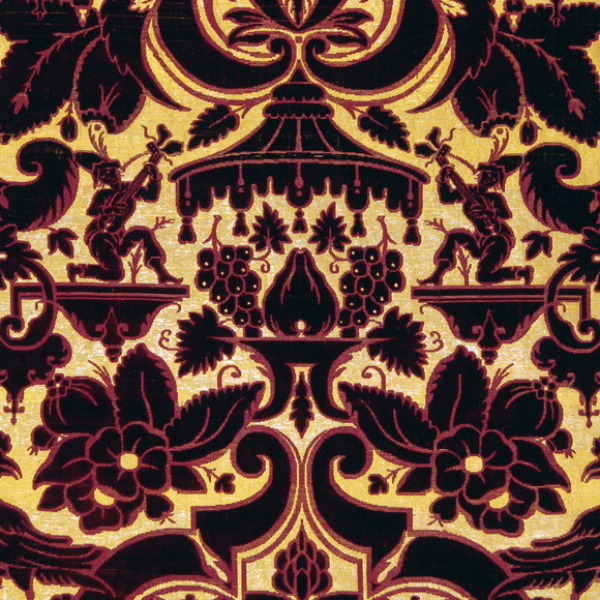 An opulent c.1870 French voided red silk velvet with a gold metallic ground woven at Lyon, France by Tassinari & Chatel with a large repeated design of a floral urn flanked by birds, rampant lions below, and a canopy flanked by a pair of minstrals. Woven for a particular patron, this velvet is an example of the kind of textiles woven for the very wealthy in the the 19th century. Provenance: Tassinari & Chatel archives.