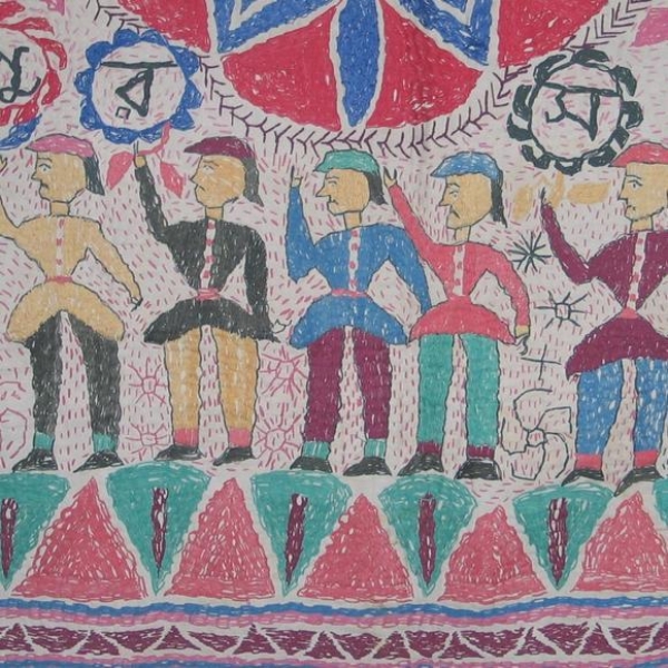 Early 20th century from Bangladesh, India bed cover called a kantha embroidered in cotton on cotton ground with large central floral design in the center in red, blue, green & yellow bordered by a line of women and men, probably at a festival.